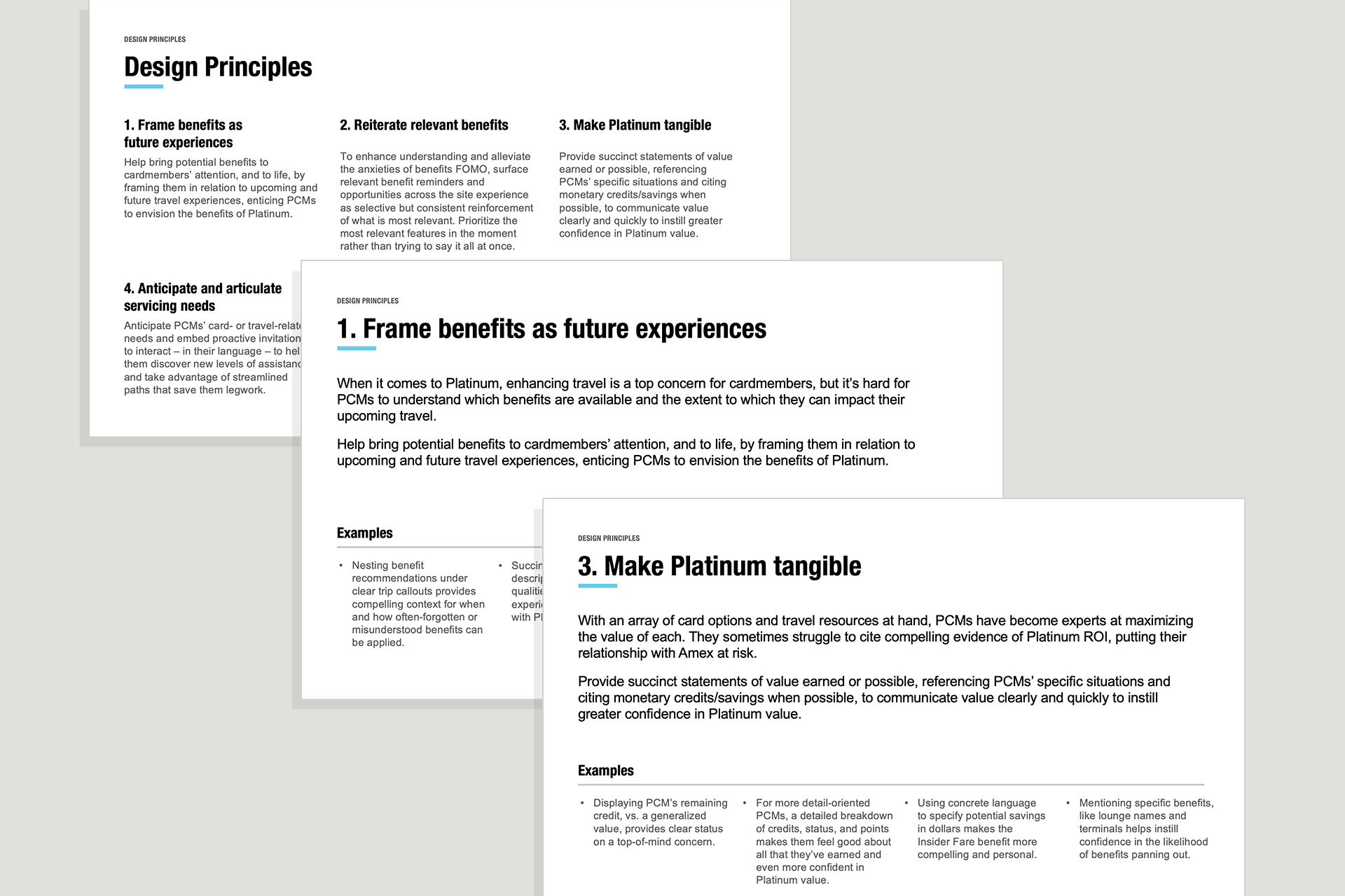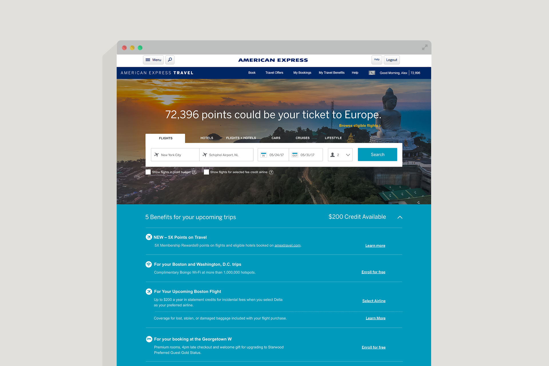 The American Express Travel and Lifestyle site offers great perks for Platinum cardmembers, but it lacked a clear and consistent approach in effectively communicating these travel benefits throughout the browsing and customer booking journey. With as much data as American Express has on its customers, the site wasn’t leveraging this data strategically to offer a more personalized experience, especially for frequent users. Core pages in the site experience were redesigned and new concepts developed as part of a larger digital strategy to surface relevant benefit information and cross-selling opportunities at every stage, empowering Platinum card members to make the most of their benefits in context.