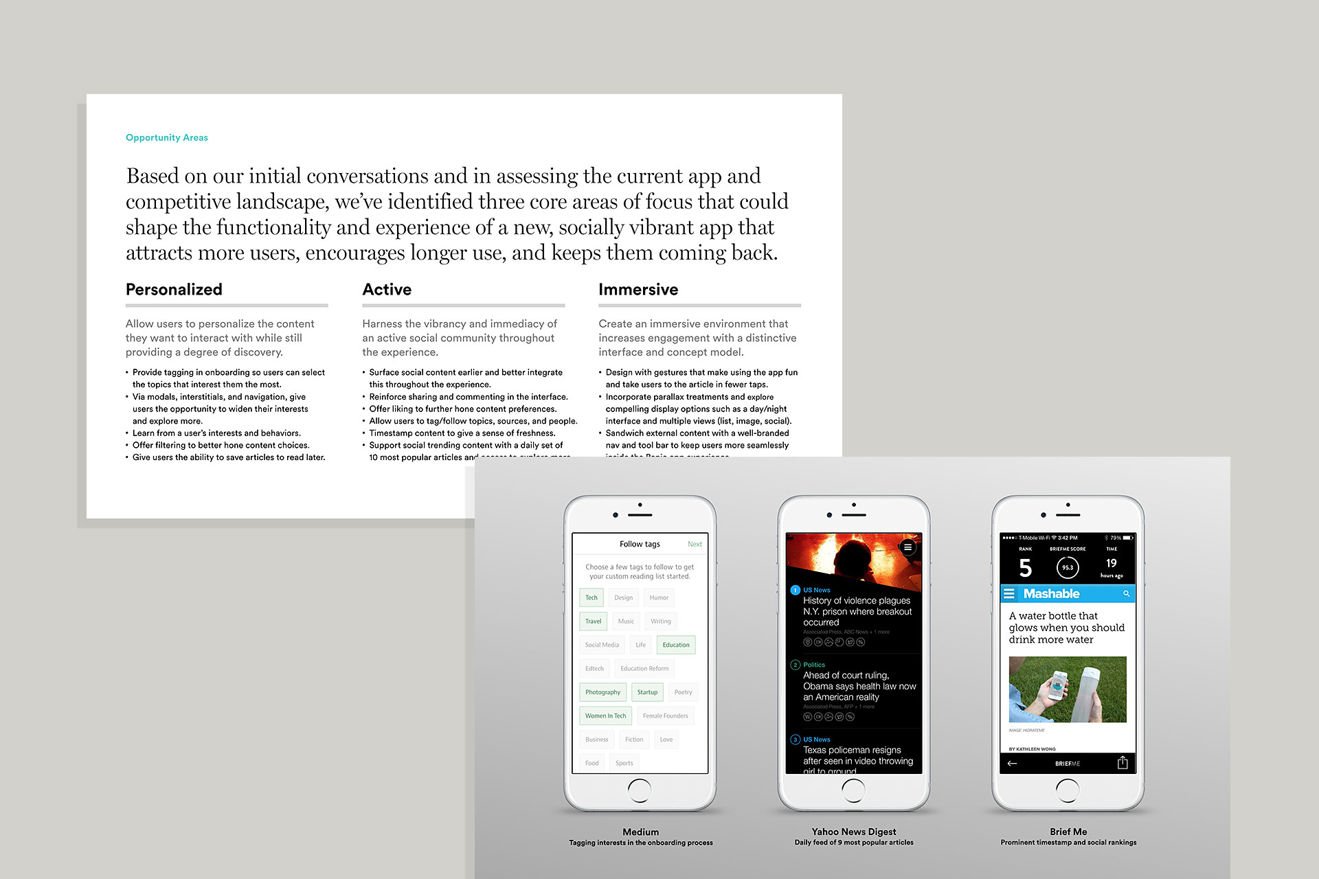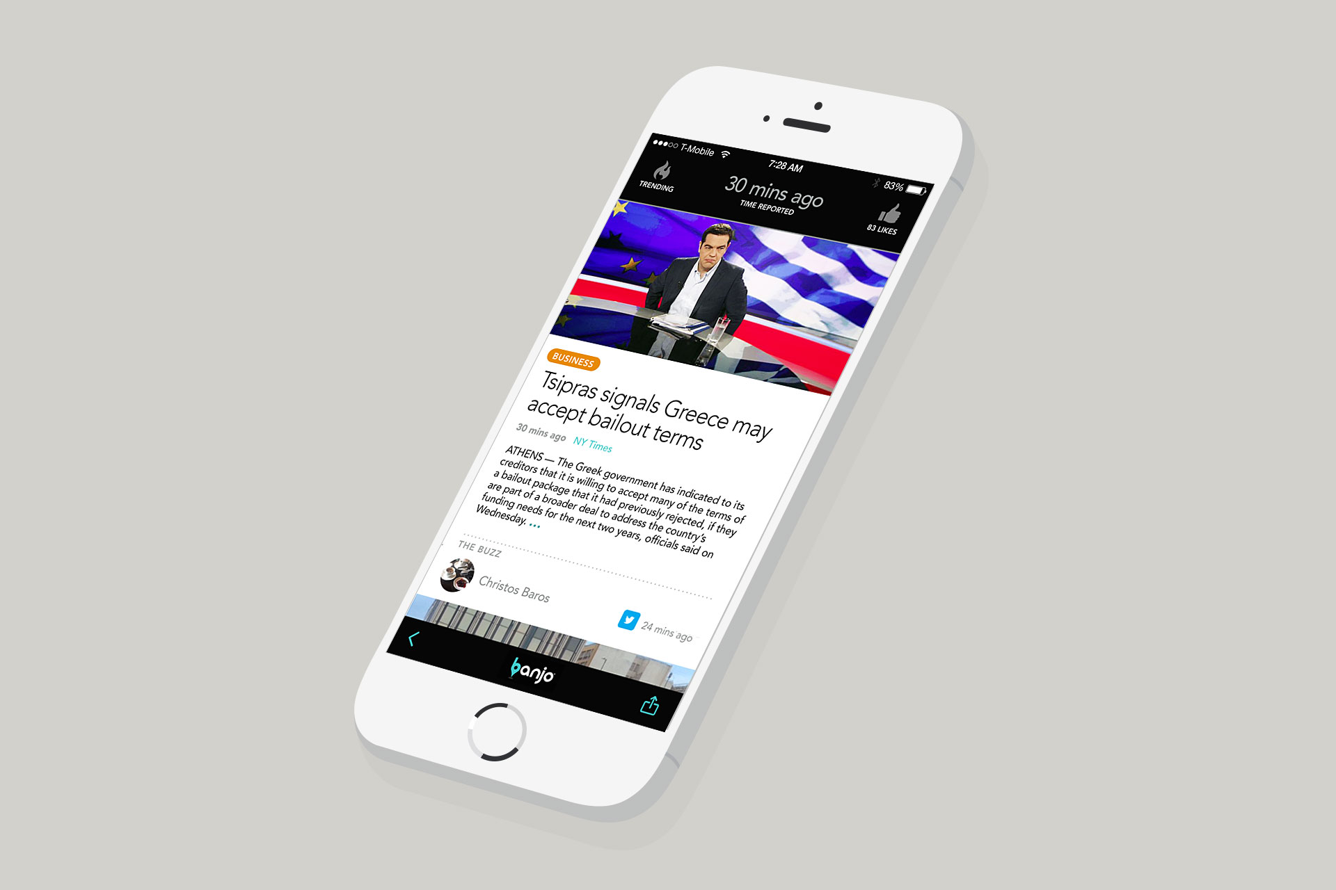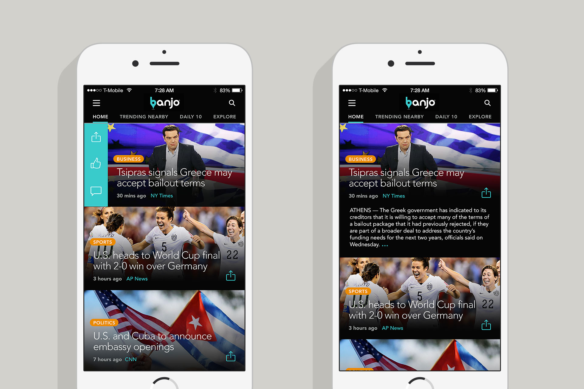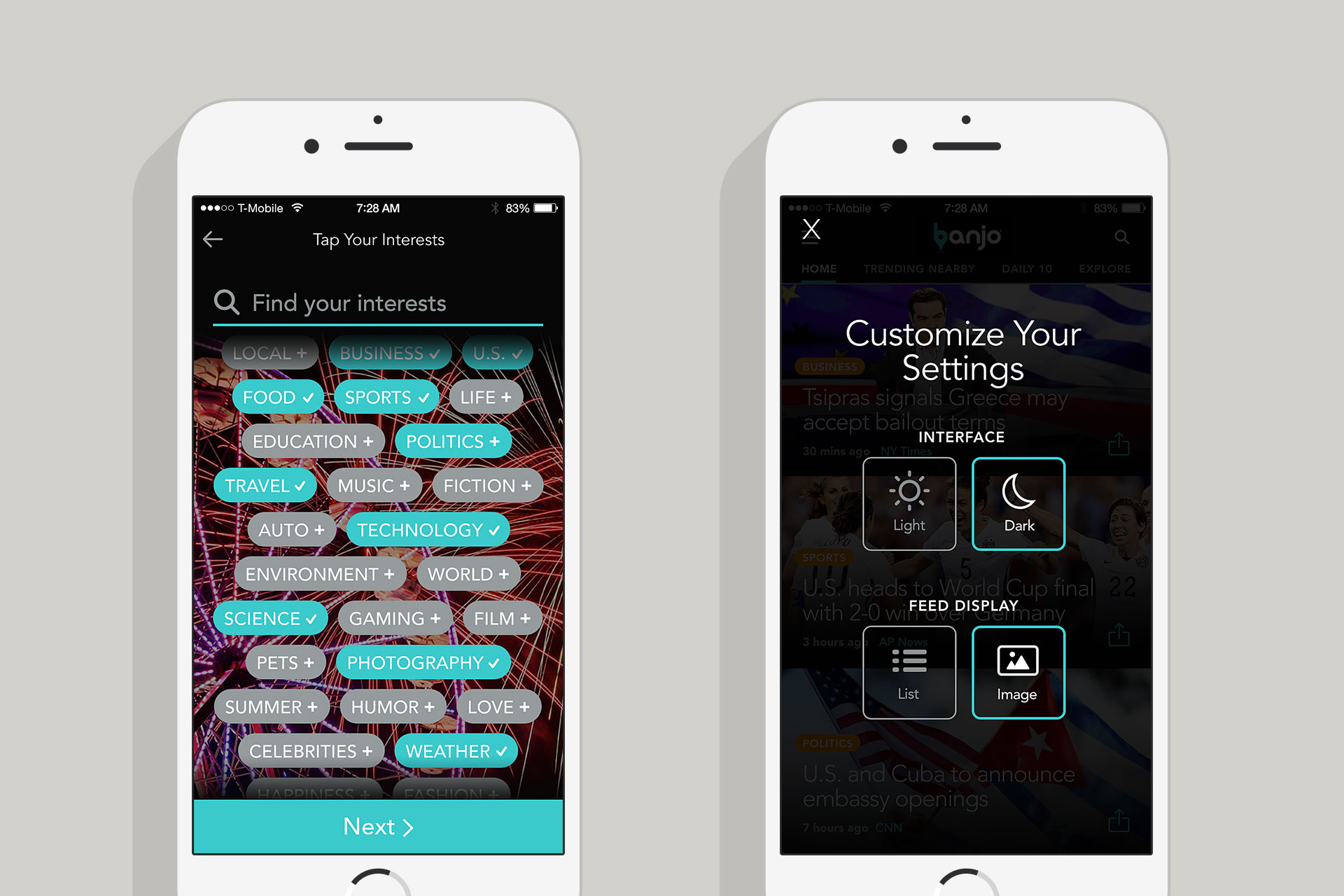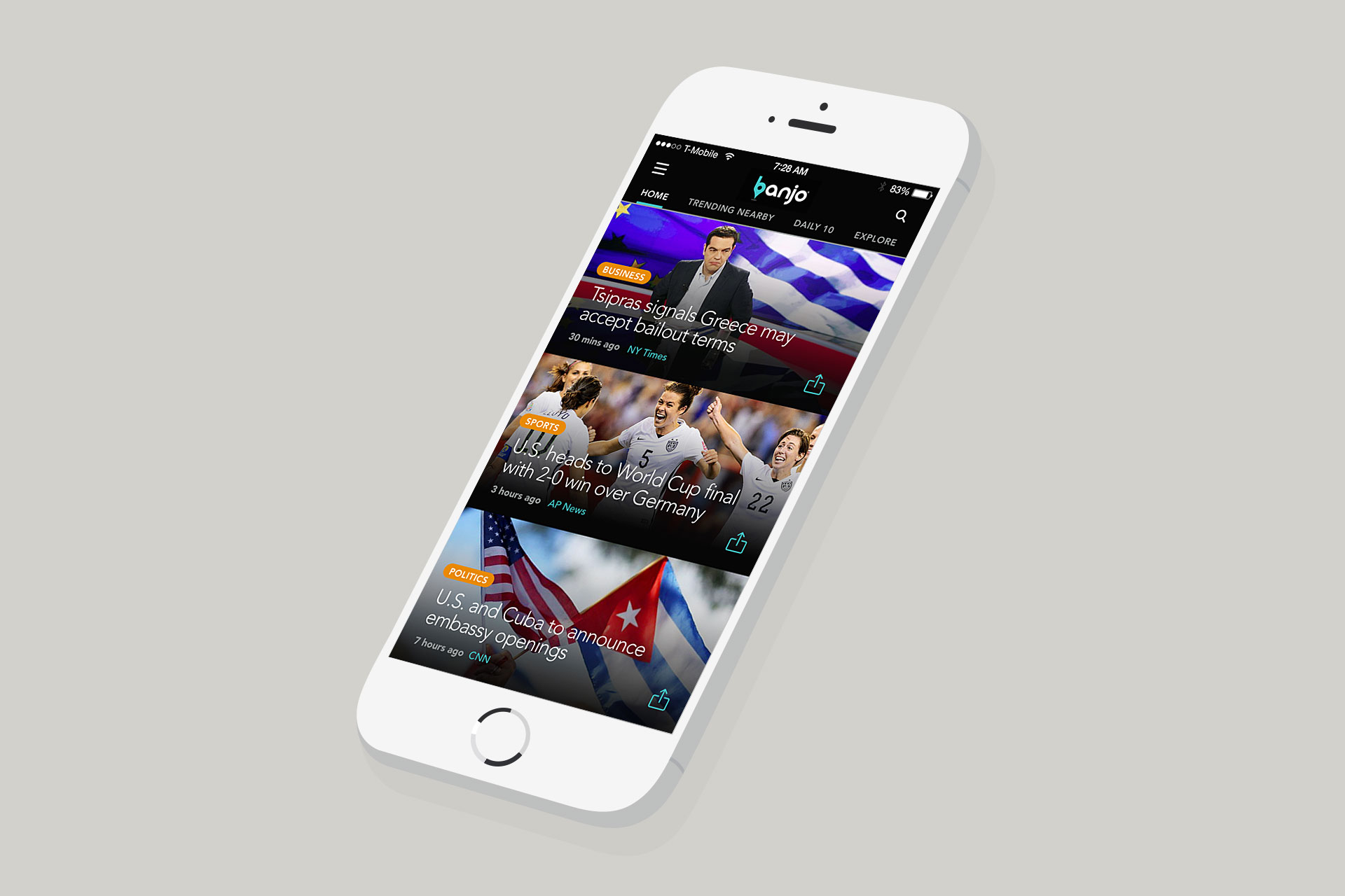 Banjo’s social content platform organizes the world’s social news and events by location, giving users access to what’s happening anywhere in the world, in real time. While the platform provides content to major media outlets, the consumer-facing mobile app had become outdated and in need of a redesign. The proposed iOS redesign would learn from user behavior and allow users to personalize the content they want to interact with while still providing a degree of discovery. The redesign would harness the vibrancy and immediacy of an active social community throughout the experience with tagging, timestamping and liking.