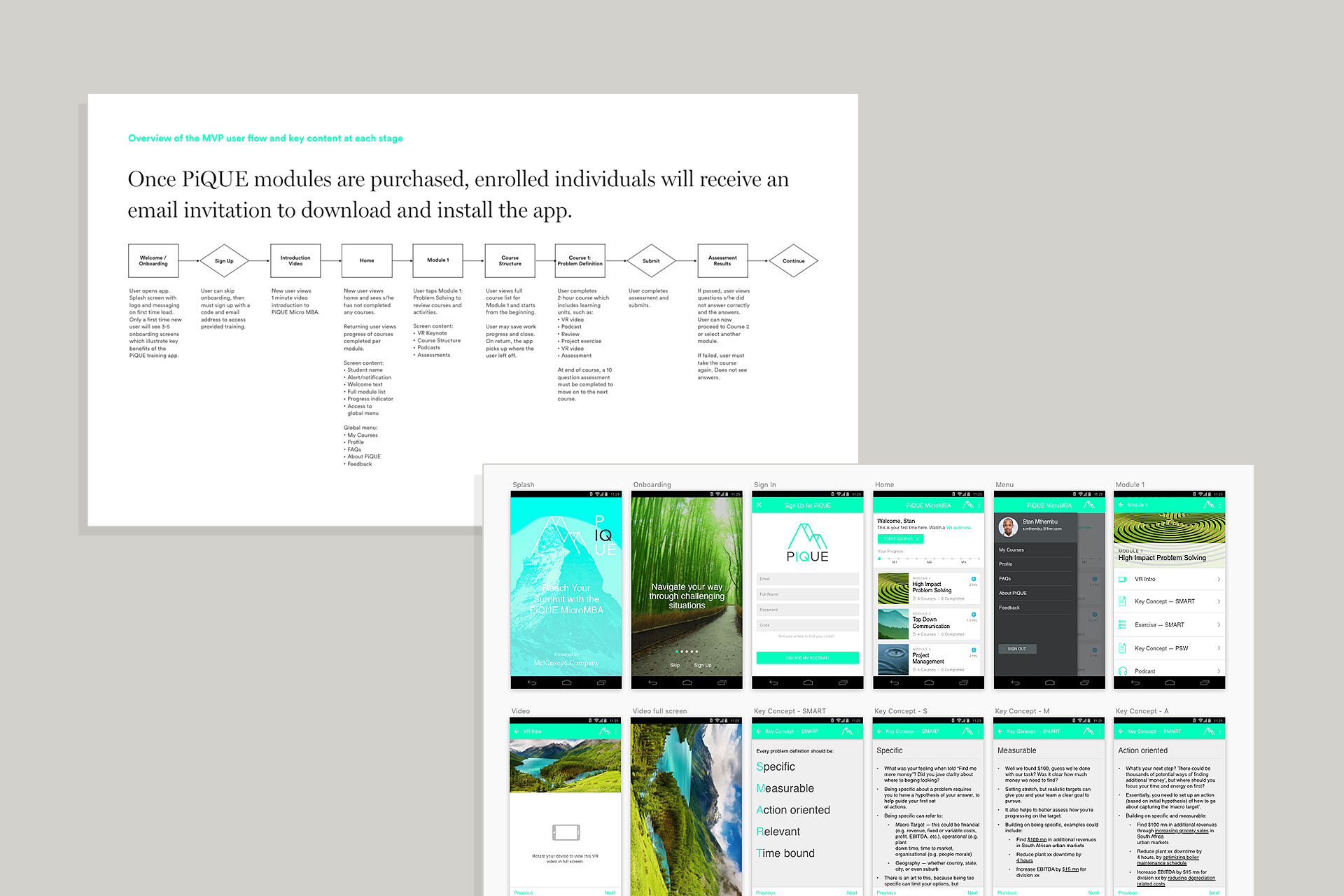 McKinsey innovation consultants can pitch and get the budget to develop a digital product or service MVP as a proof of concept to validate and alpha test prior to a commitment for a full product release. This was the case for McKinsey PiQUE, a mobile-based micro MBA training course geared for an EMEA audience. McKinsey identified a gap and an opportunity to provide McKinsey-caliber management training to an EMEA audience, especially Africa and the Middle East.