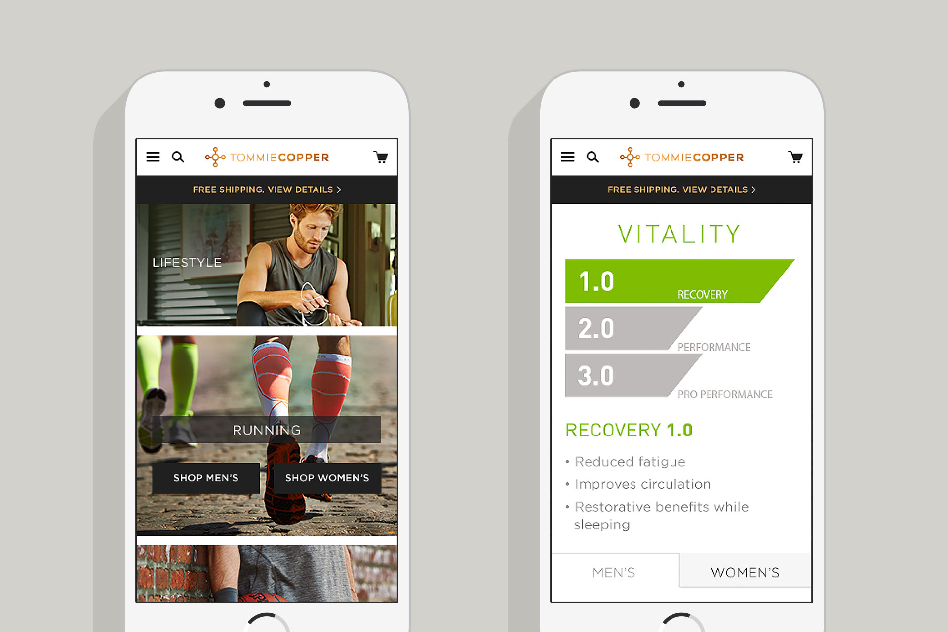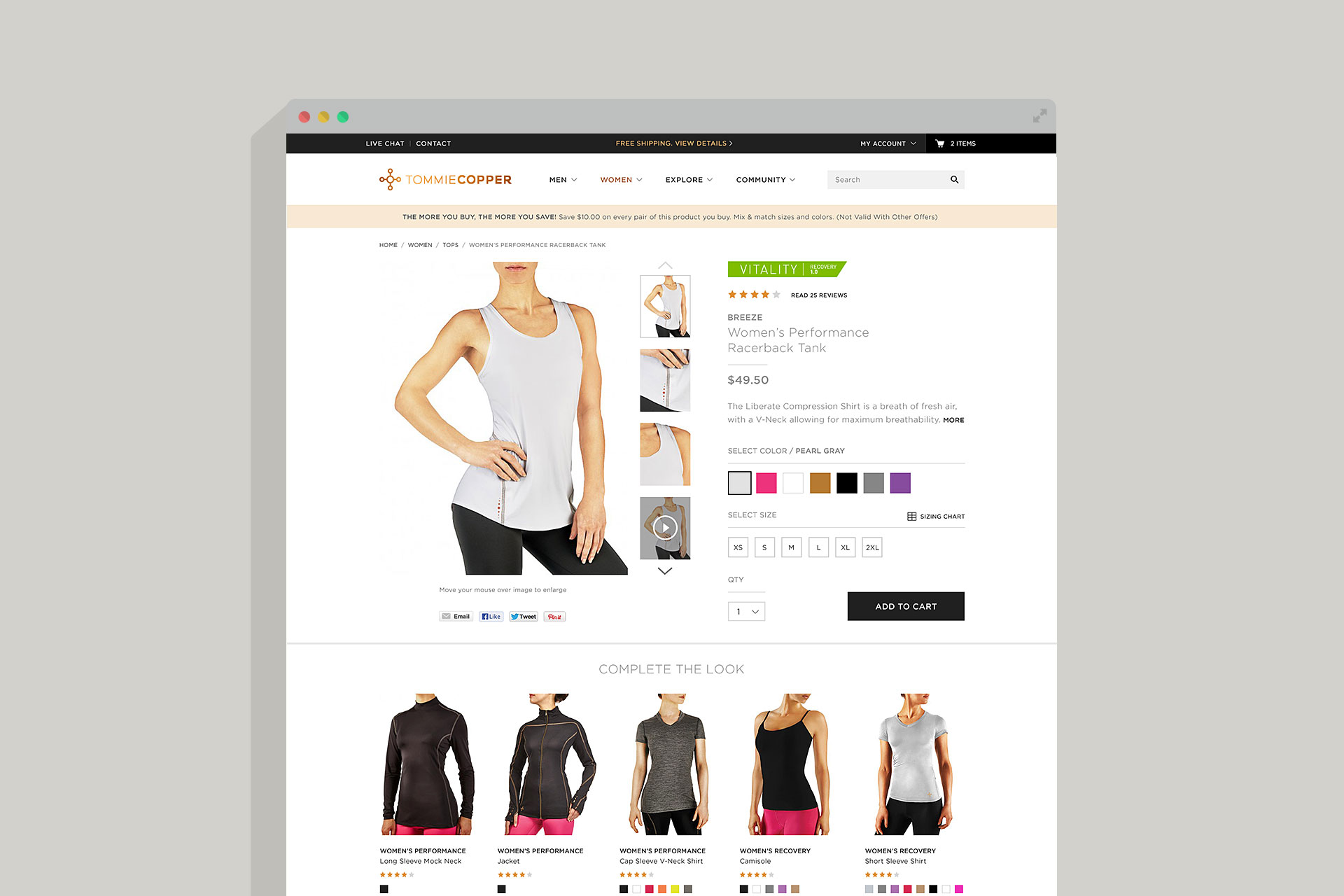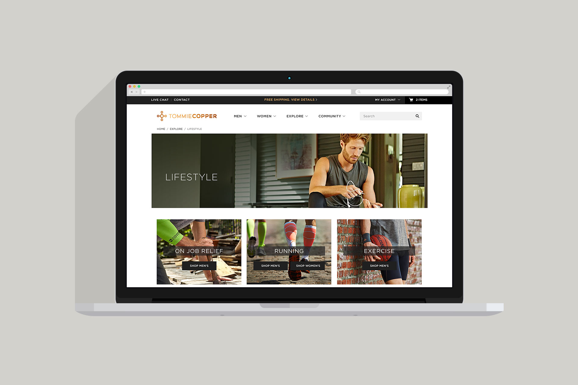 As a leader in copper-infused compression sleeves, Tommie Copper sought a new online store to broaden its focus on recovery products to a much larger product mix that includes performance-based athletic gear to appeal to the fitness-conscious consumer audience. The new responsive site features a bold, sleek and contemporary aesthetic that is accented by custom lifestyle photography and crisp product shots. The new navigation model allows customers to shop by product, shop by where it hurts and shop by benefit. Mega menus, useful filtering and clear wayfinding makes the site easy-to-use and translates well to the mobile interaction.