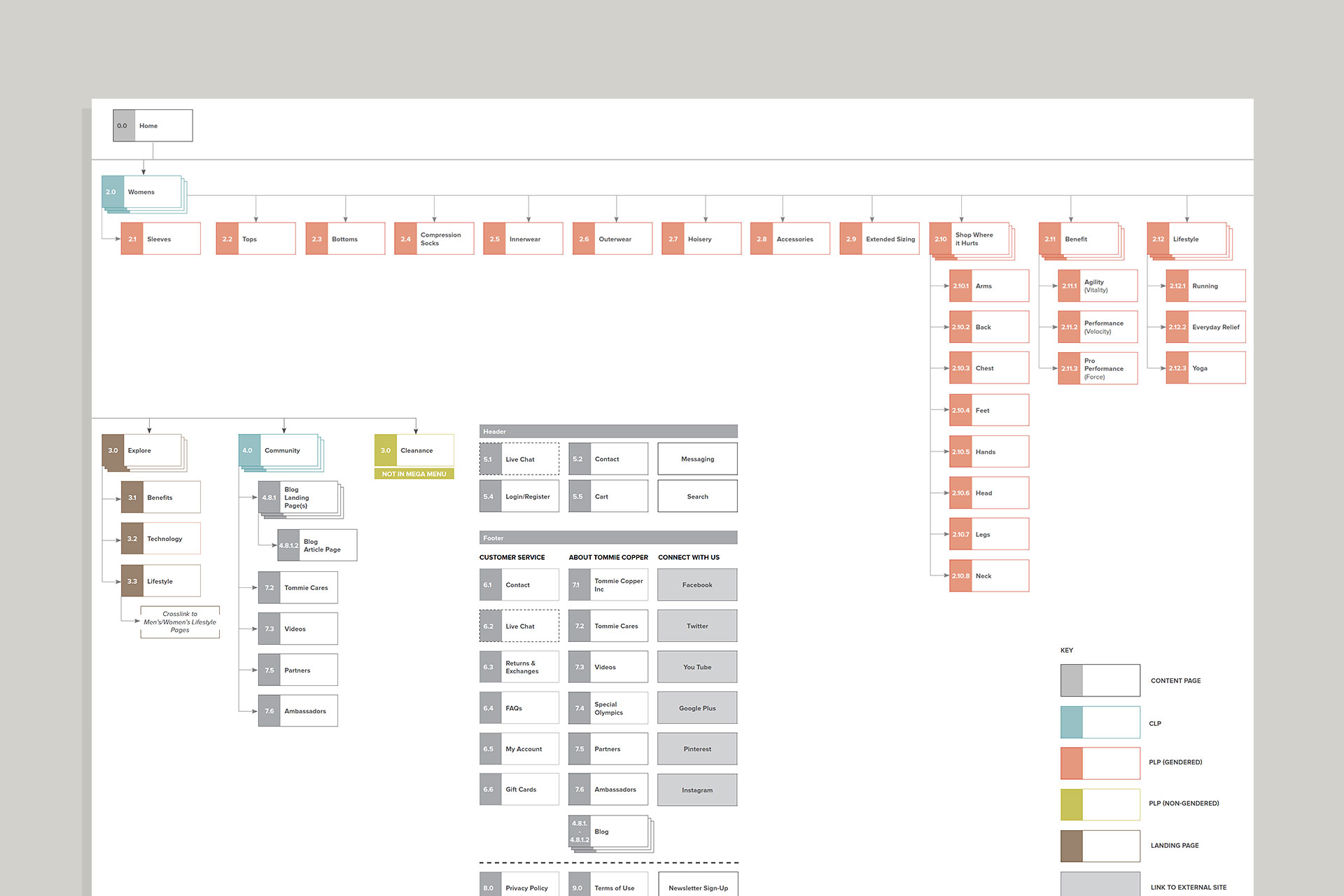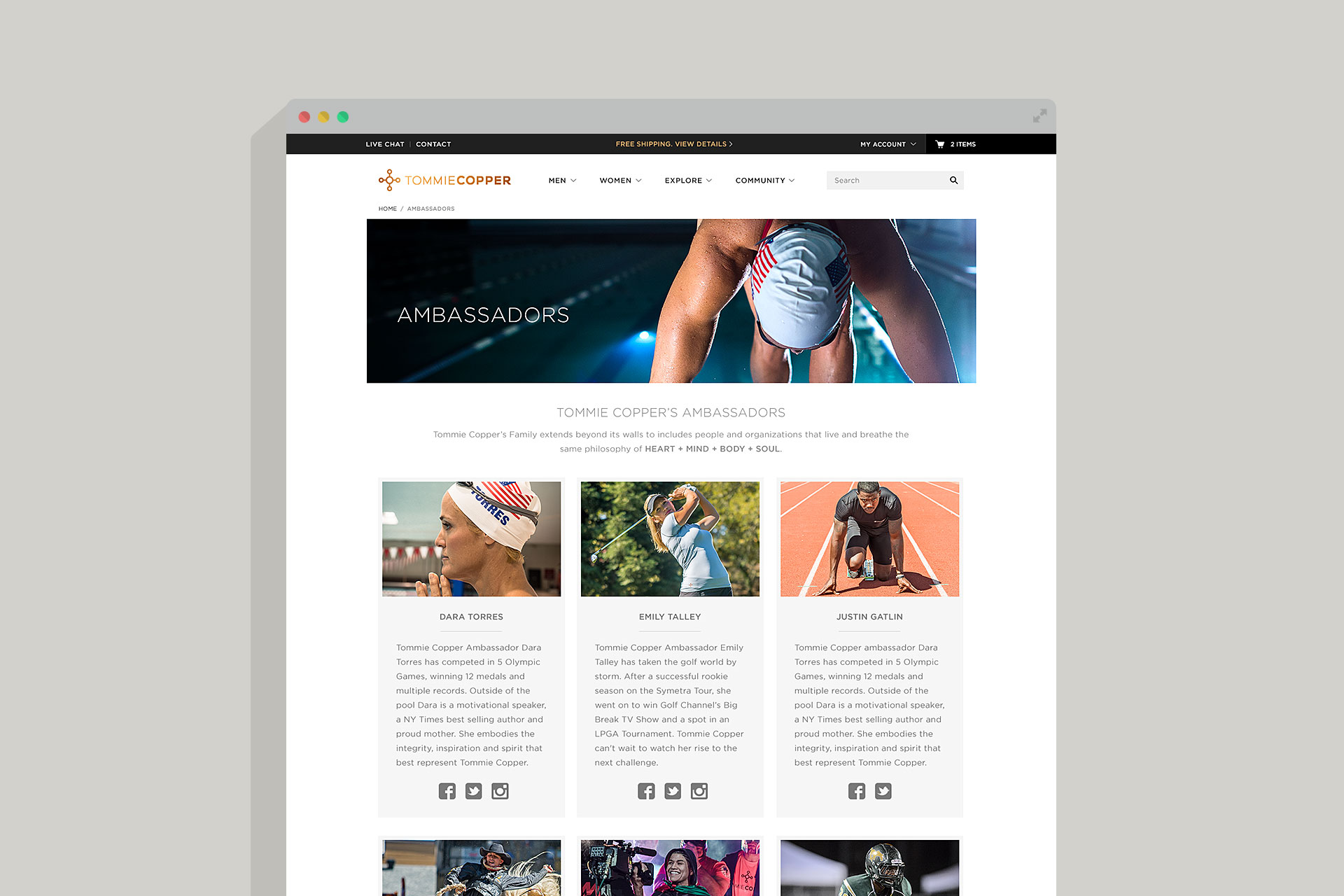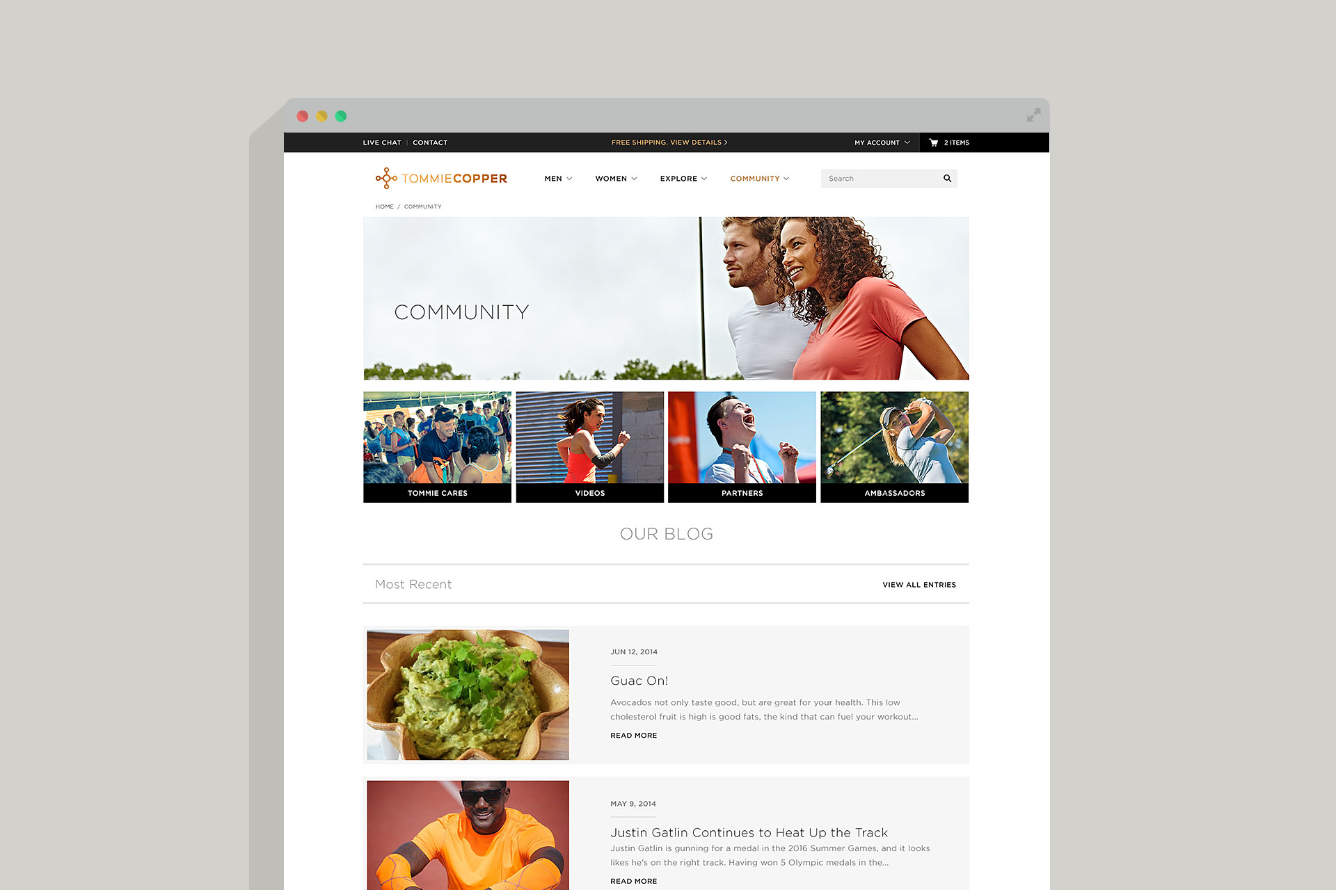 As a leader in copper-infused compression sleeves, Tommie Copper sought a new online store to broaden its focus on recovery products to a much larger product mix that includes performance-based athletic gear to appeal to the fitness-conscious consumer audience. The new responsive site features a bold, sleek and contemporary aesthetic that is accented by custom lifestyle photography and crisp product shots. The new navigation model allows customers to shop by product, shop by where it hurts and shop by benefit. Mega menus, useful filtering and clear wayfinding makes the site easy-to-use and translates well to the mobile interaction.